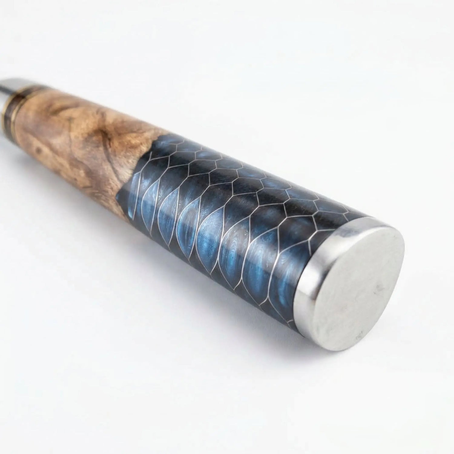 Le manche de ce couteau, conçu en bois exotique et résine, allie élégance naturelle et performance. Le bois, sélectionné pour sa solidité et sa résistance à l’humidité, est sublimé par la résine qui le stabilise et le protège durablement. Cette fusion de matières donne naissance à un manche unique, aux motifs et aux couleurs toujours différents. Sa forme ronde offre une prise en main fluide et agréable, idéale pour un usage prolongé sans fatigue.